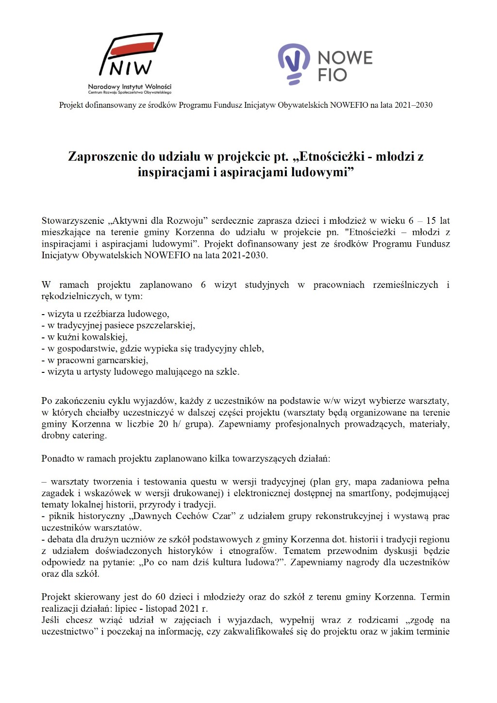 Serdecznie zapraszamy do udziału w projekcie "Etnościeżki- młodzi z inspiracjami i aspiracjami ludowymi"