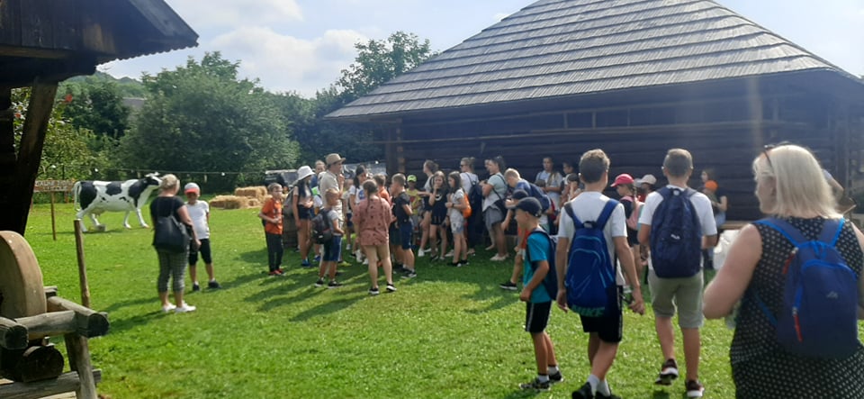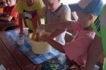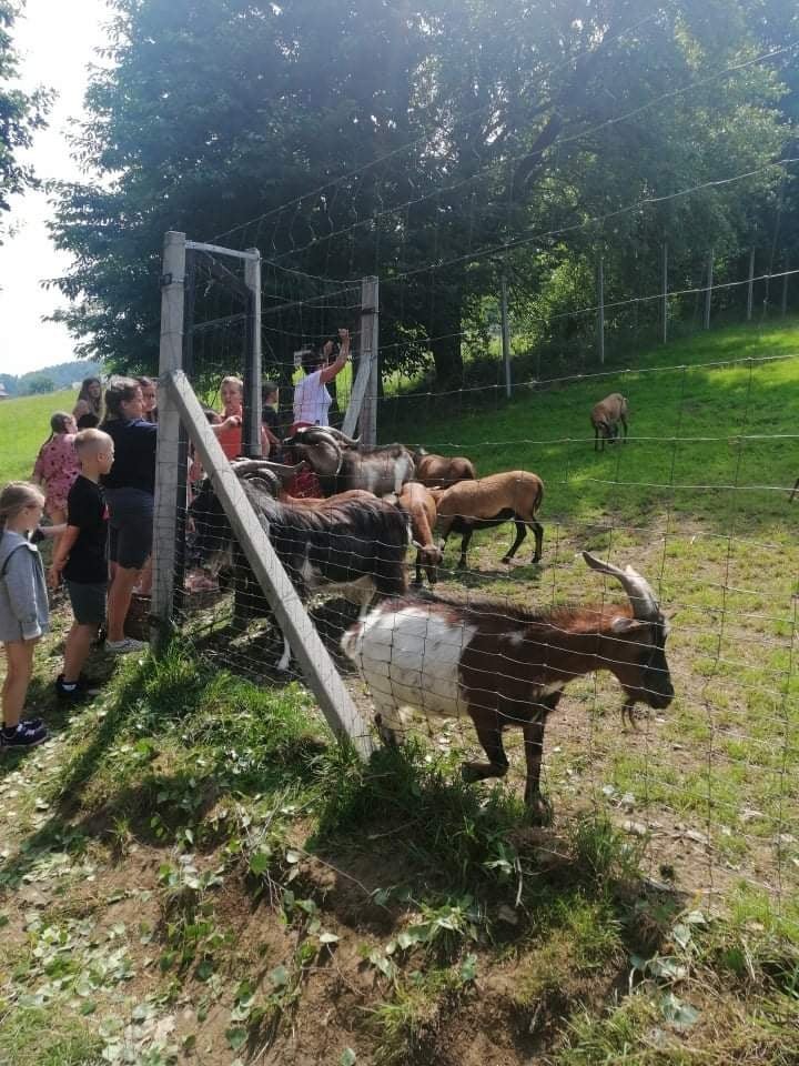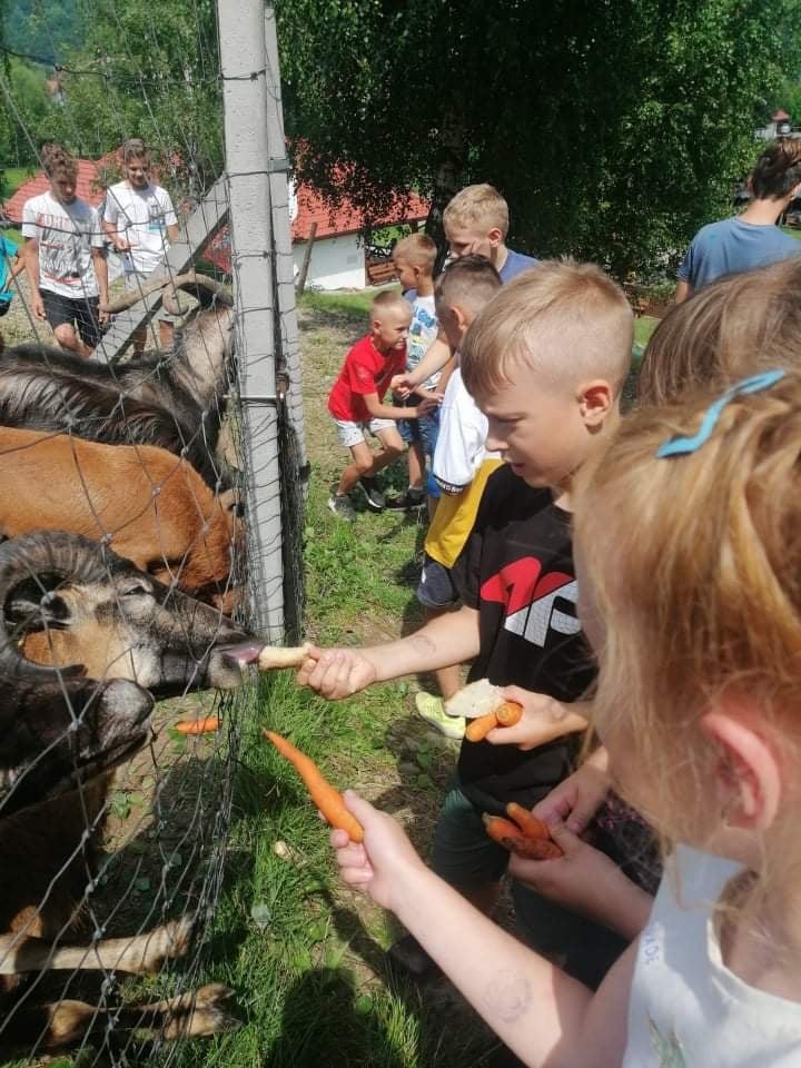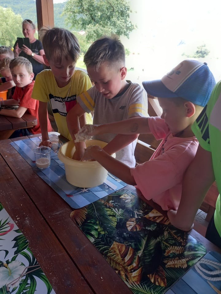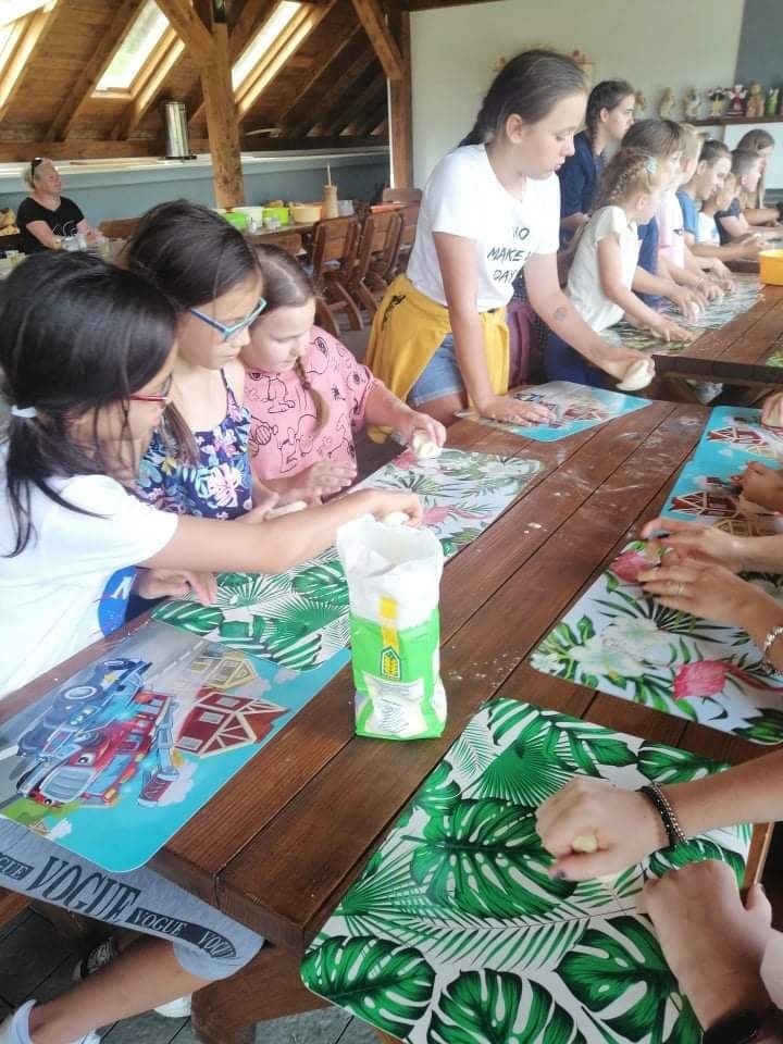 Na miejscu zostaliśmy przywitani ciepłymi racuszkami i pysznym kompotem. Dzieci zobaczyły jak powstaje chleb "od ziarenka do bochenka". Mogły spróbować własnych sił na warsztatach z wypieku chlebków-podpłomyków i robienia masła. Czas umiliła im fantastyczna gra terenowa , pieczenie ziemniaków oraz spotkanie ze zwierzętami. Miały również okazję skorzystać z przejażdżki na kucykach. Po pysznym obiedzie aż żal było stamtąd odjeżdżać.